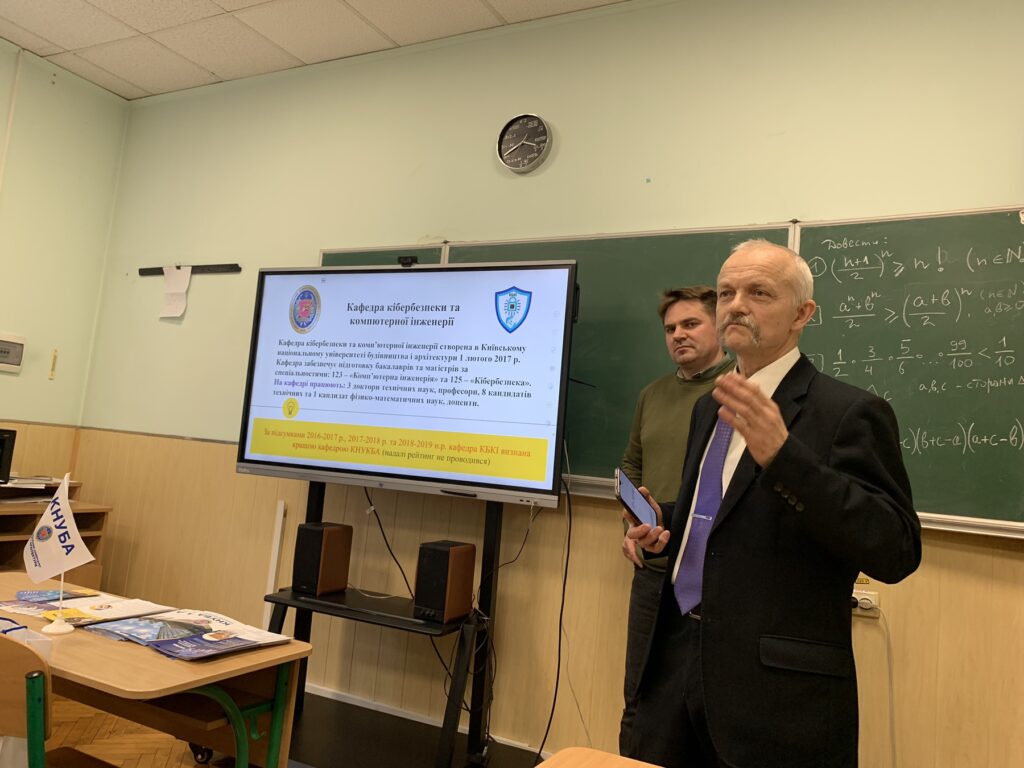8 лютого 2024 р. завідувач кафедри кібербезпеки та комп’ютерної інженерії Юрій Іванович Хлапонін, доценти Євгенія Євгенівна Шабала, Дмитро Олександрович Гуменний відвідали Київський природничо-науковий ліцей № 145 і провели профорієнтаційну роботу серед учнів старших класів.