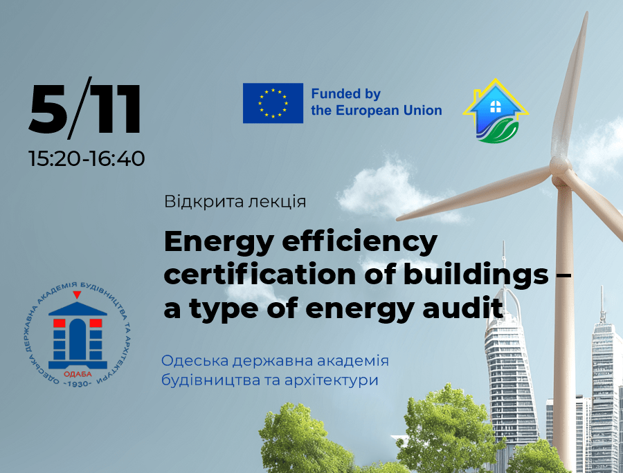 Запрошуємо студентів-магістрів та викладачів на відкриту лекцію Energy efficiency certification of buildings – a type of energy audit, що відбудеться 5 листопада у форматі онлайн, початок – 15:20. Приєднатись до лекції можуть усі зацікавлені особи.