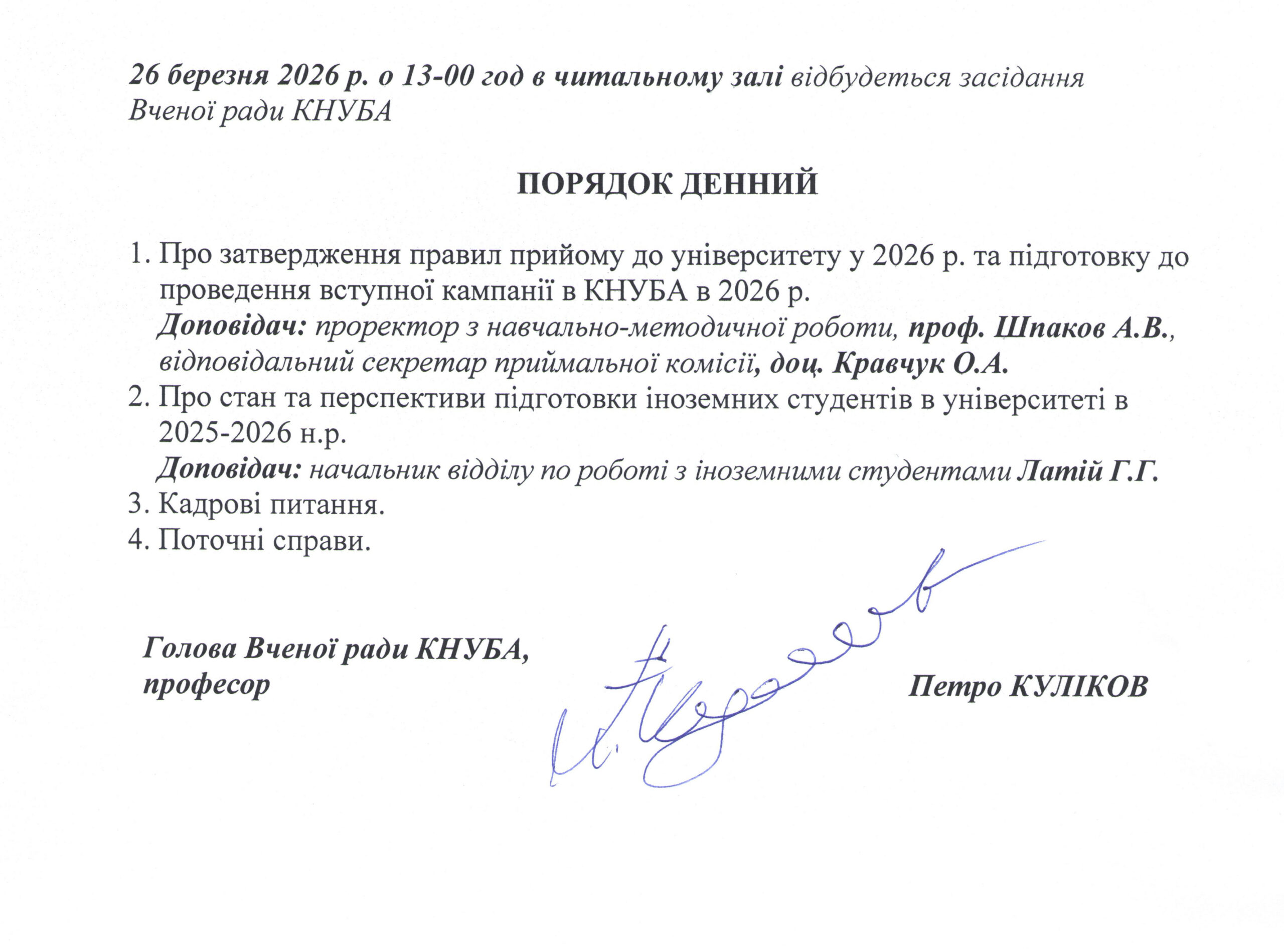 Найближче засідання Вченої ради Наступне засідання Вченої ради відбудеться в читальній залі 26 березня 2026 р. о 13.00 Порядок денний засідання Вченої радиПоточні справи, які будуть розглянуті на засіданні Вченої радиКадрові питання: Список осіб, що балотуються на здобуття вчених званьСписок осіб, що балотуються до обрання на посади за конкурсом Поширити це: Поширити у Facebook (Відкривається у новому вікні) Facebook Поширити на X (Відкривається у новому вікні) X Поширити на LinkedIn (Відкривається у новому вікні) LinkedIn Поширити у WhatsApp (Відкривається у новому вікні) WhatsApp Поширити у Telegram (Відкривається у новому вікні) Telegram