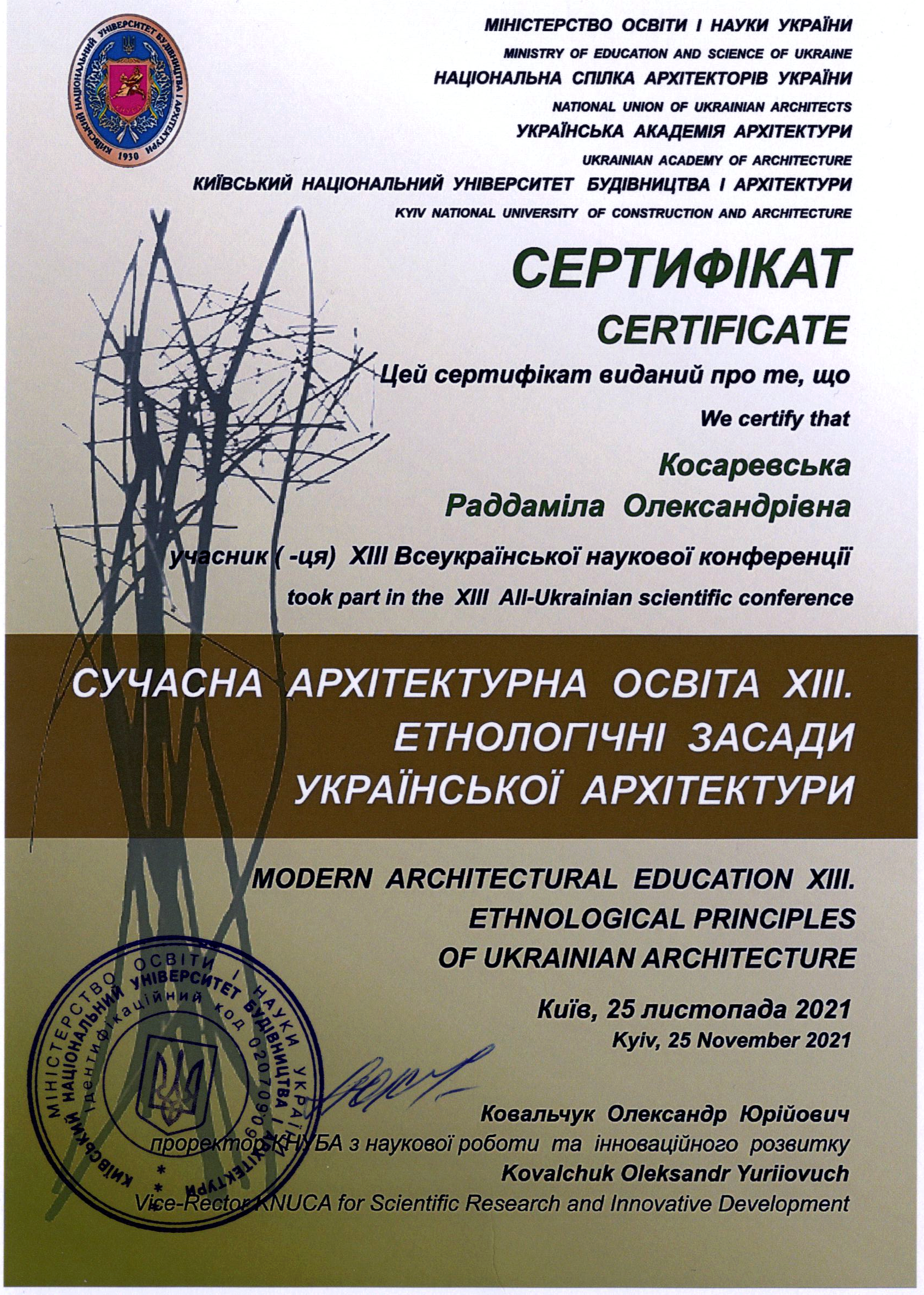 Усеїнова А.А., Третяк Ю.В., Косаревська Р.О. Історичний аспект розвитку середовища дошкільних виховних установ в Україні // ХІІІ Всеукраїнська наукова конференція “Сучасна архітектурна освіта. Етнологічні засади української архітектури” 25 листопада 2021 р., м.Київ. Київ: КНУБА, 2021.