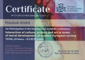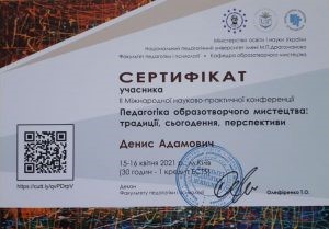 Pylypchuk, O., Krivenko, O., Polubok A., Zapryvoda A., Zapryvoda V. (2021). Ecological Innovations of Materials in Art Objects to Create a Comfortable Human Environment. Proceedings of the 2021 2nd International Conference on Modern Education Management, Innovation and Entrepreneurship and Social Science (MEMIESS 2021), Jul. 2th-4th, 2021 in Xi’an, China. Atlantis Press SARL, Part of Springer Nature, Advances in Social Science, Education and Humanities Research, Vol. 568, 1–6. DOI: https://doi.org/10.2991/assehr.k.210728.001 (зарубіжний, міжнародний науковий журнал, що індексується на платформі CNKI, Google Scholar, Web of Science CPCI та ін.)