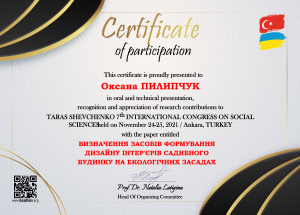 Пилипчук О., Бабич А. Визначення засобів формування дизайну інтер’єрів садибного будинку на екологічних засадах // Taras Shevchenko: Мaterials in the collection 7th International congress on social: sciencesh eld on November 24-25, 2021. Ankara. Turkey: ISPEC Publishing House, 2021, 1–2.