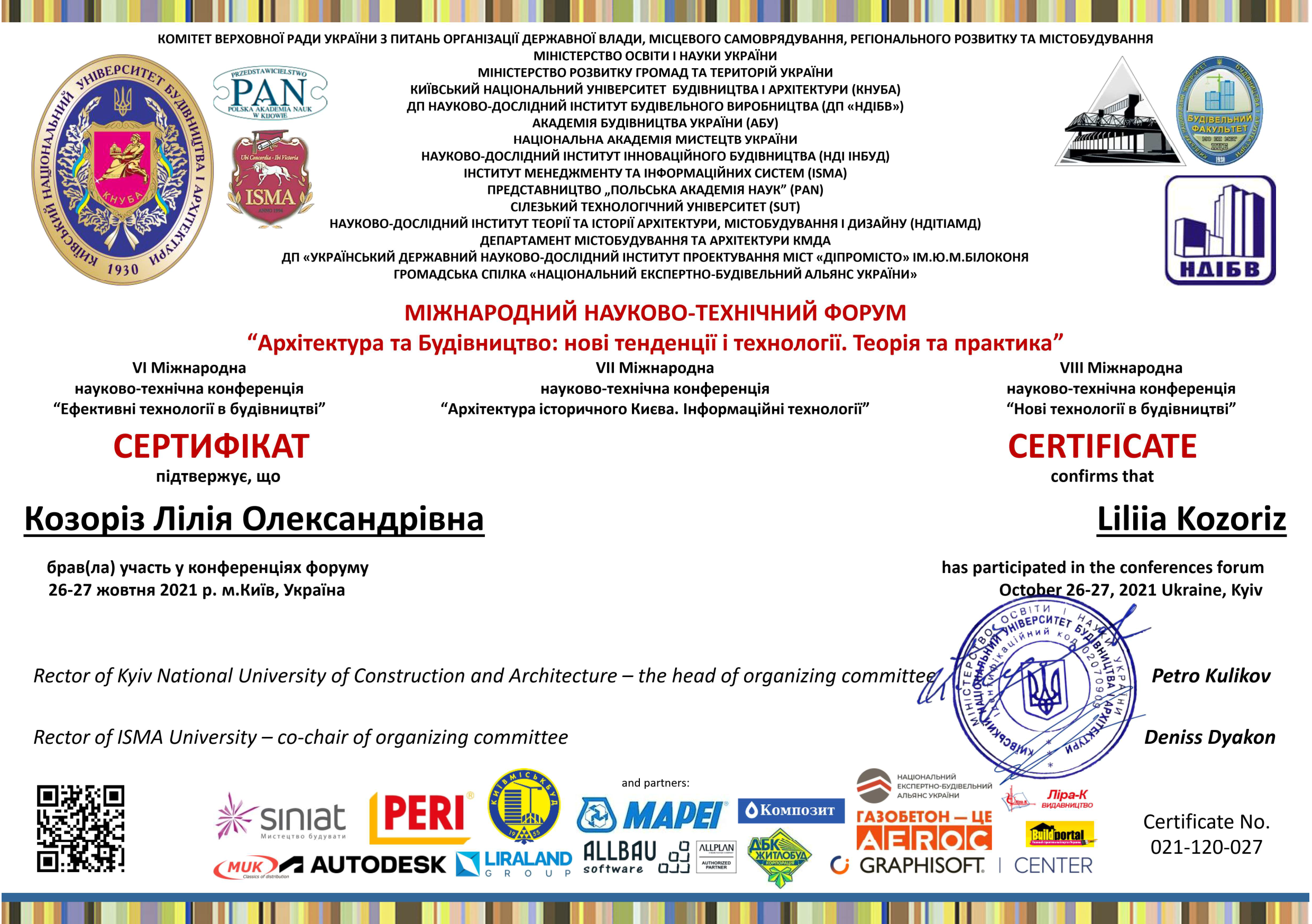2 грудня 2021 року у Київському національному університеті будівництва і архітектури відбулось нагородження десяти кращих доповідачів Студентської наукової сесії, доклади яких були представлені 26-27 жовтня 2021 року в рамках роботи Міжнародного науково-технічного форуму «Архітектура та Будівництво: нові тенденції і технології. Теорія та практика», а саме: VI Міжнародна науково-технічна конференція «Ефективні технології в будівництві», VII Міжнародна науково-технічна конференція «Архітектура історичного Києва. Інформаційні технології», VIII Міжнародна науково-технічна конференція «Нові технології в будівництві».