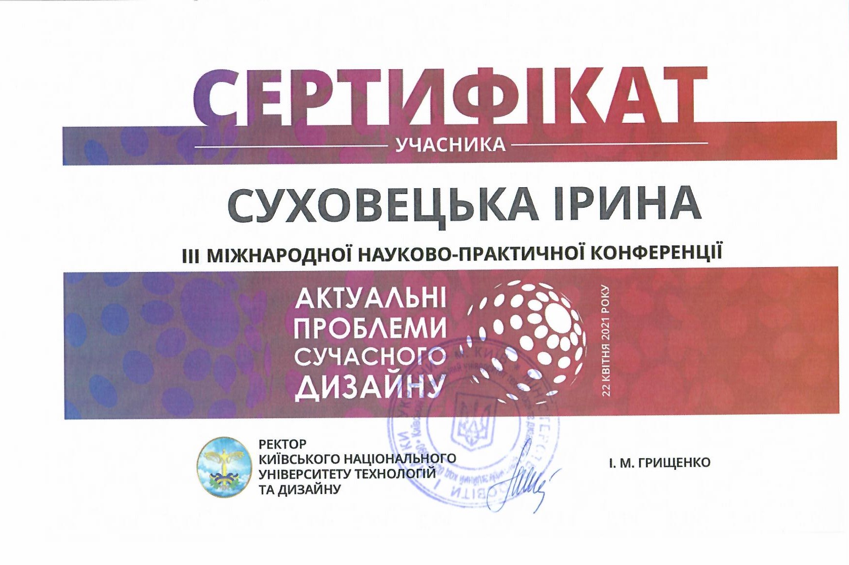 - Хараборська Ю.О., Суховецька І.В. Особливості поєднання в інтер’єрах закладів харчування творчих та споживчих процесів // Збірник матеріалів Міжнародної науково-практичної конференції «Актуальні проблеми сучасного дизайну», м. Київ, 22 квітня 2021 року. Київ: КНУТД, 2021. у 2 томах. Том 2. С.290-292. URL: https://drive.google.com/file/d/1FV-A8baOO9Z4aWucJ6oregf3Q7gqLQmI/view (Науковий керівник: к.арх., доцент Хараборська Ю.О.)