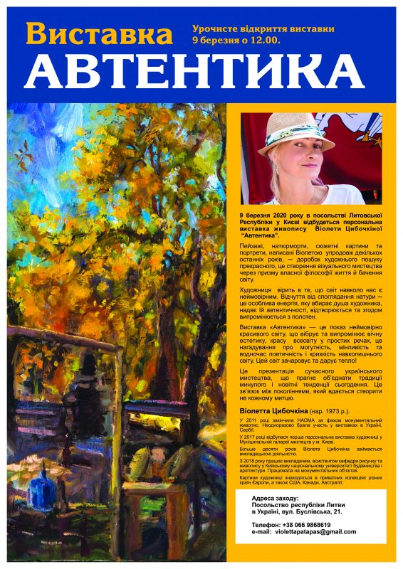 Персональна виставка “АВТЕНТИКА” (було представлено 25 творчіих робіт) / Посольство Литовської Республіки в Україні (адреса: м.Київ, вул.Буслівська, 21). – 09.03.2020.