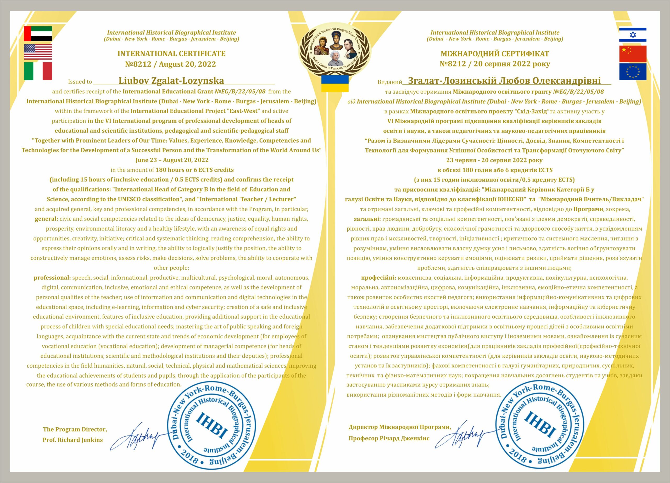 23.06.2022р. – 20.08.2022 р. Участь у VІ міжнародній програмі підвищення кваліфікації керівників закладів освіти і науки, а також педагогічних і науково-педагогічних працівників «Разом із Визначними Лідерами Сучасності: Цінності, Досвід, Знання, Компетентності і Технології для Формування Успішної Особистості та Трансформації Оточуючого Світу», International Historical Biographical Institute (Dubai – New York – Rome – Burgas – Jerusalem – Beijing), міжнародний серифікат №8212 від 20.08.2022р. в рамках Міжнародного освітнього гранту №EG/B/05/08 та міжнародного освітнього проекту «Схід-Захід».