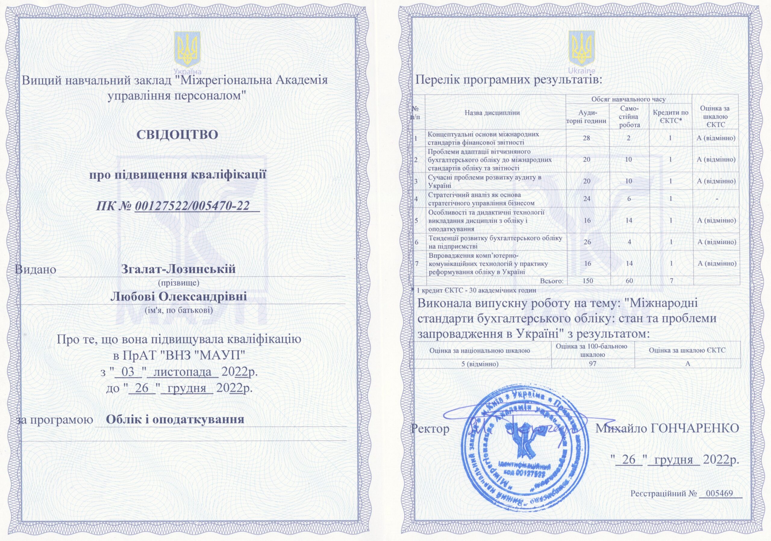 03.11.2022 р. – 26.12.2022 р. Підвищення кваліфікації за програмою «Облік і оподаткування», ПрАТ «ВНЗ «Міжрегіональна Академія управління персоналом» (5 кредитів ЄКТС), свідоцтво ПК№ 00127522/005470-22 від 26.12.2022р.