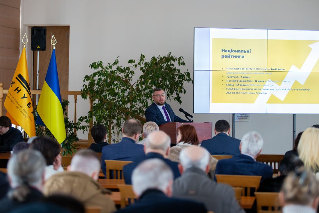 Ректор КНУБА Олексій Дніпров представив оцінку результатів реалізації стратегії розвитку університету в минулому році та окреслив ключові орієнтири на 2026 рік. Попри зовнішні виклики, університет продемонстрував стійкість, збільшивши кількість здобувачів освіти на 14,3% та вперше увійшов до престижних глобальних рейтингів Times Higher Education та QS World University Rankings: Europe.