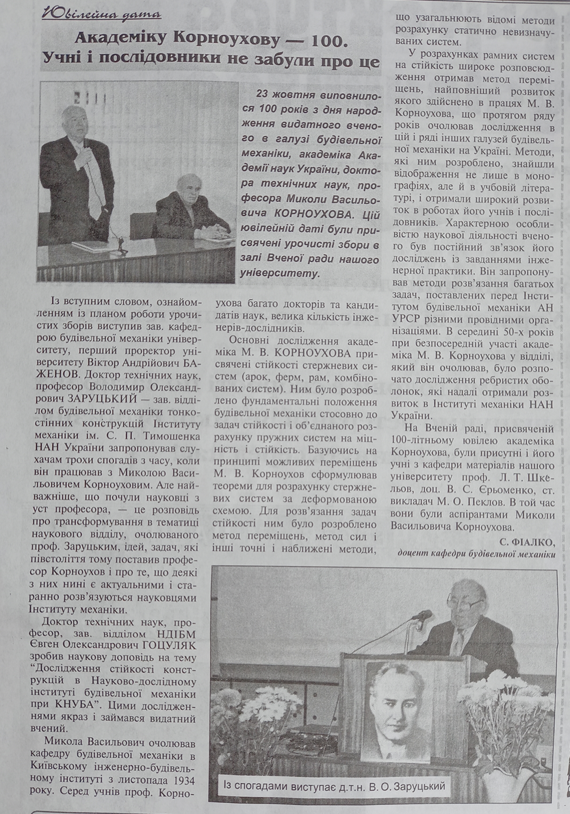 В 1949 році Микола Васильович Корноухов опублікував велику монографію «Прочность и устойчивость стержневых систем», за яку в 1950 році був удостоєний звання лауреата Сталінської премії, а в травні 1951 року його обирають академіком Академії наук УРСР.
