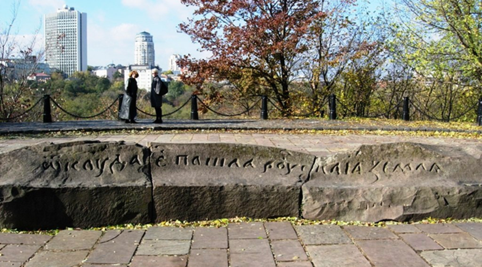 - Пам’ятний камінь «ѿкуда єсть пошла руская земѧ» – 1980-ті – відомий монумент у Києві поруч із залишками фундаменту Десятинної церкви. Він вказує на місце, де, згідно з «Повістю минулих літ», почалося формування Київської Русі.