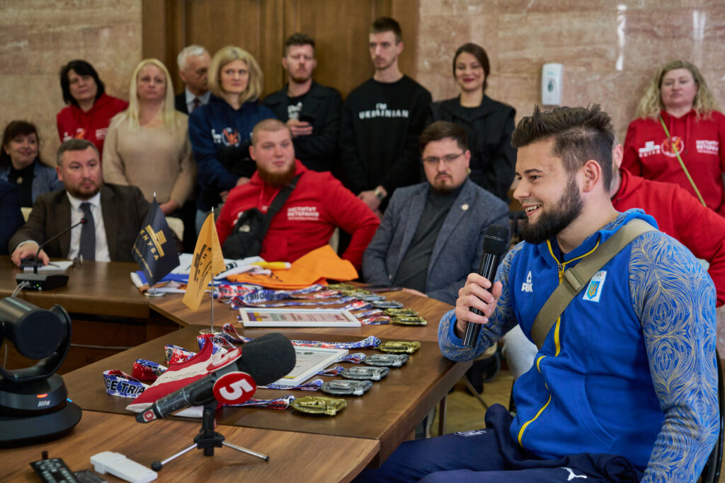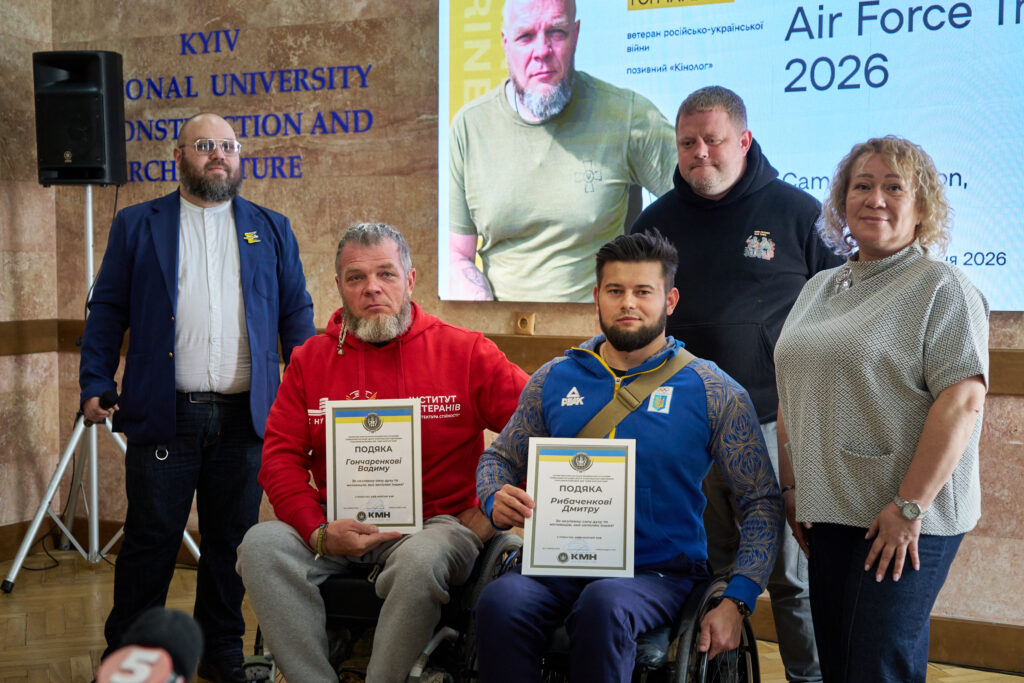 У КНУБА відбулася зустріч із ветераном російсько-української війни, студентом університету та спортсменом з адаптивних видів спорту Вадимом Гончаренком, який здобув 6 перемог на змаганнях Marine Corps and Air Force Trials 2026 у США у складі збірної України. Також у зустрічі взяв участь ветеран Дмитро Рибаченко, який змагався у складі збірної.