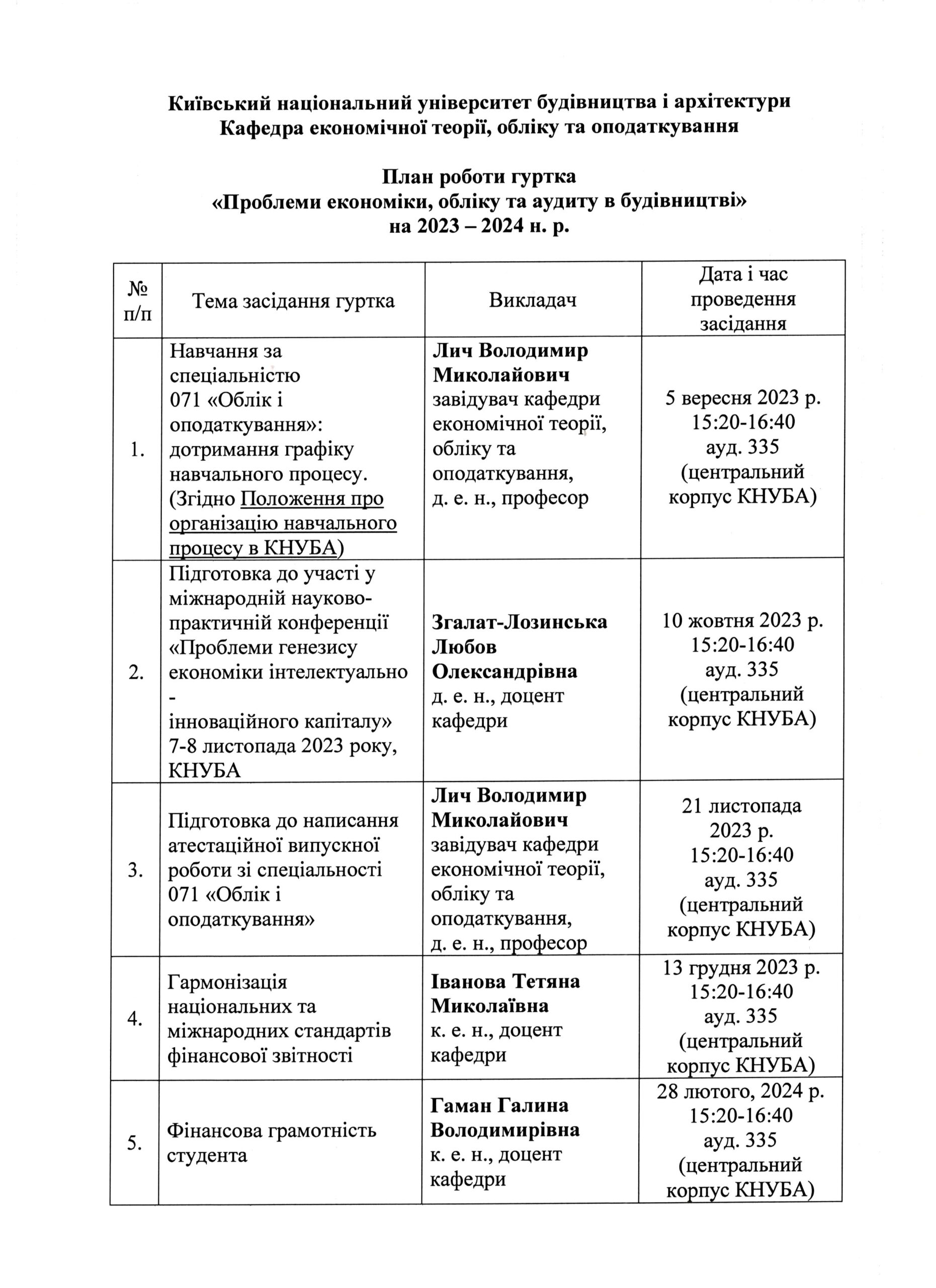Склад студентського наукового гуртка кафедри економічної теорії, обліку та оподаткування «Проблеми економіки, обліку та аудиту в будівництві»
