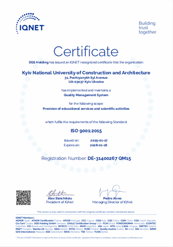 Органом сертифікації DQS GmbH після проведення наглядового аудиту в грудні 2025 року прийнято позитивне рішення щодо підтвердження дії сертифікату відповідності системи менеджменту Київського національного університету будівництва і архітектури на відповідність вимогам міжнародного стандарту ISO 9001:2015 за номером 31400267 QM15.